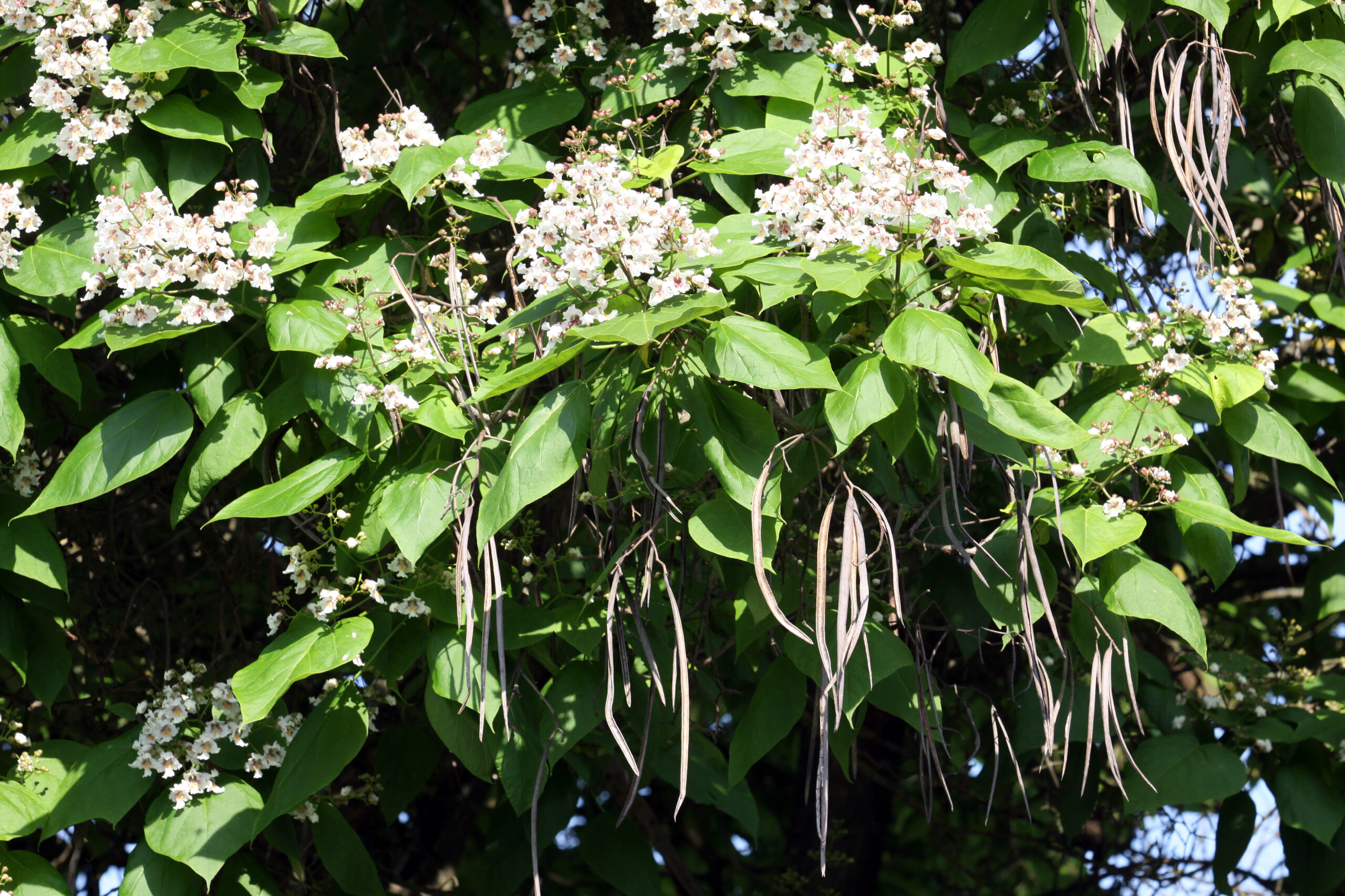 Pripis k fotografiji: Ameriška katalpa (Catalpa bignonioides) v času cvetenja – mogočno drevo z velikimi listi in izrazitimi belimi cvetovi, primerno za večje urbane vrtove in parke.