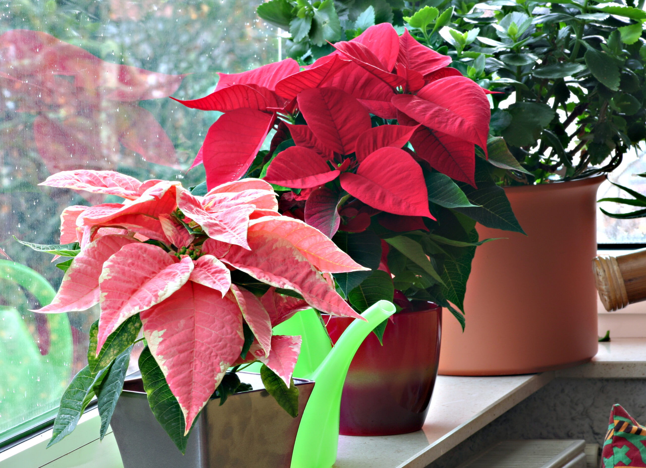 Naslovna fotografija: Božični zvezdi v dveh prazničnih odtenkih – klasično rdeča in rožnato pisana sorta – krasita okensko polico v zimskem času.