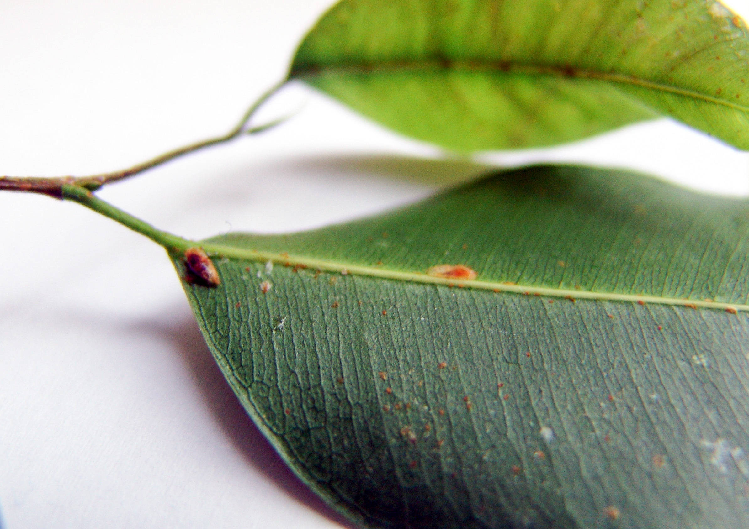 Pripis k fotografiji: Kapar (ščitasta kaparica) na spodnji strani lista limone – značilni rjavi ščitki ob žilah lista.