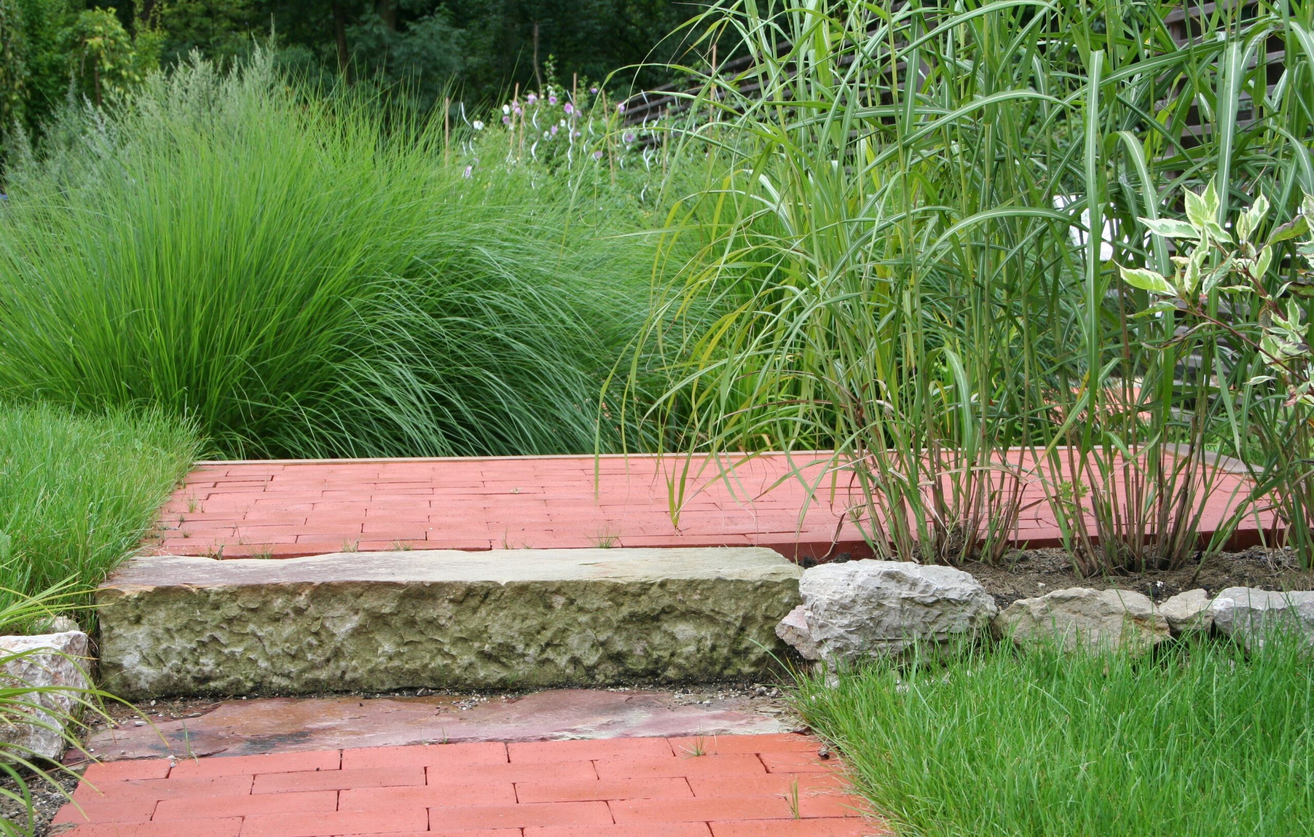 Trave so posajene ob opečnati poti, ki jo robijo naravni kamni. Takšna kombinacija deluje naravno in hkrati elegantno – kamniti robovi dajejo strukturo, trave pa jo z mehkim valovanjem razbijejo.