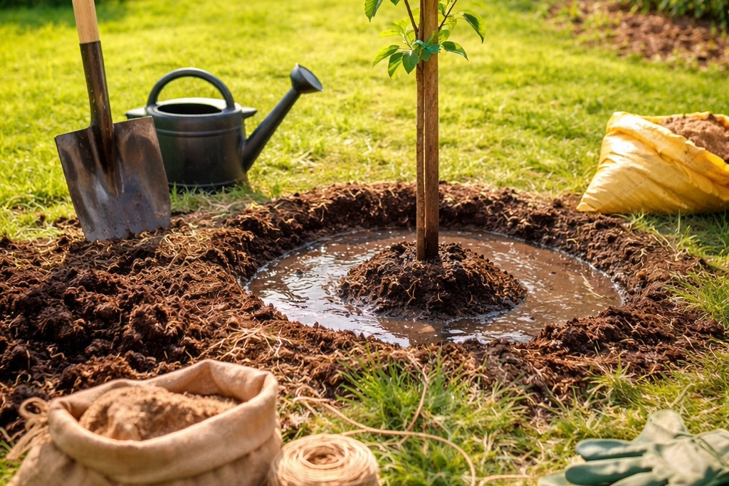 Pripis k fotografiji: Pravilno posajena sadika sadnega drevesa z oporo in zalivalno kotanjo – dober začetek za zdravo rast.