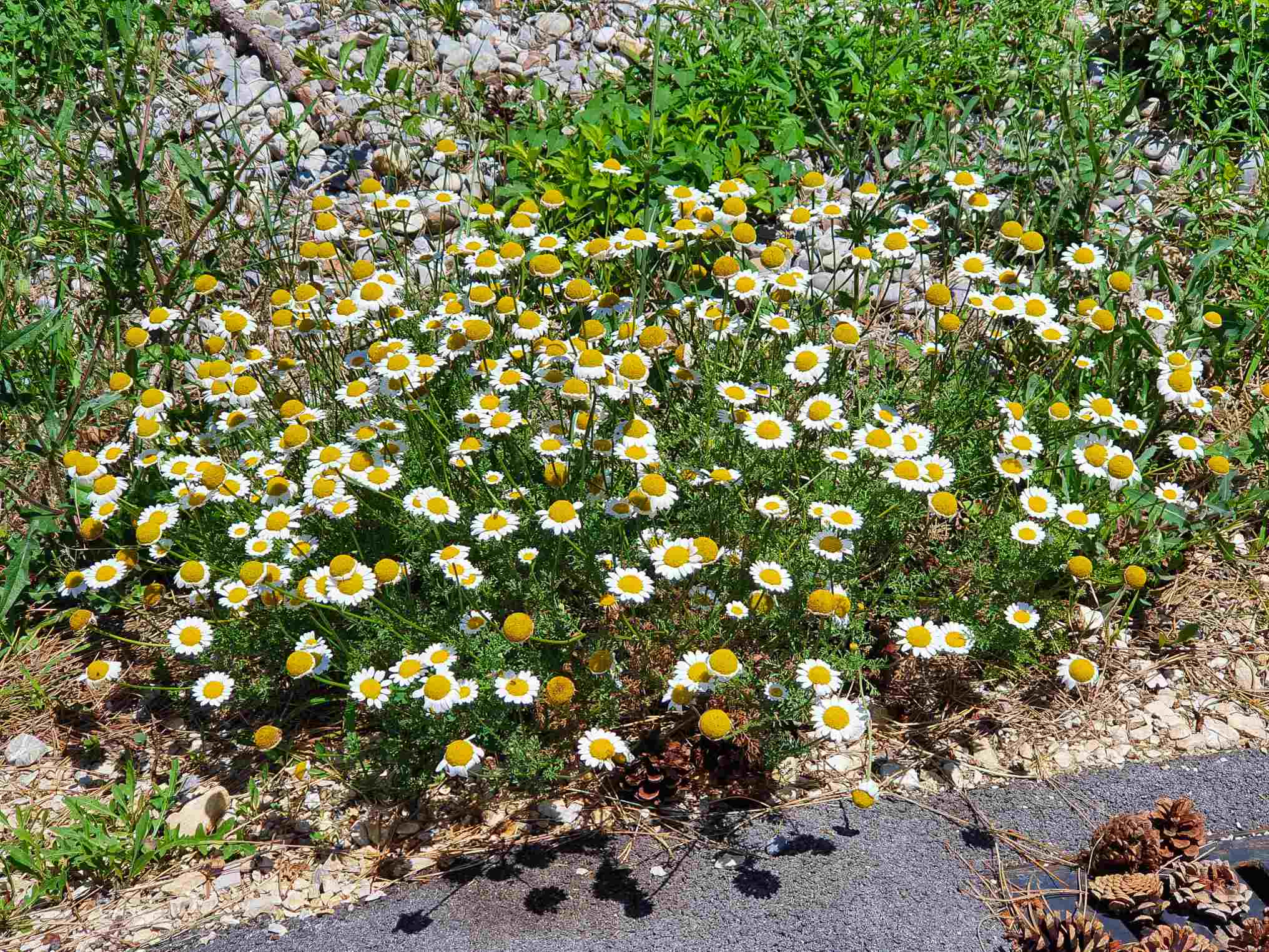 Na fotografiji vidimo bujno razraščeno rimsko kamilico (Chamaemelum nobile), ki s svojimi drobnimi belimi cvetovi in rumenimi sredinami ustvarja pravi poletni prizor. Čeprav jo pogosto zamenjujemo s pravo kamilico, gre za povsem drugačno rastlino – predvsem po načinu rasti.