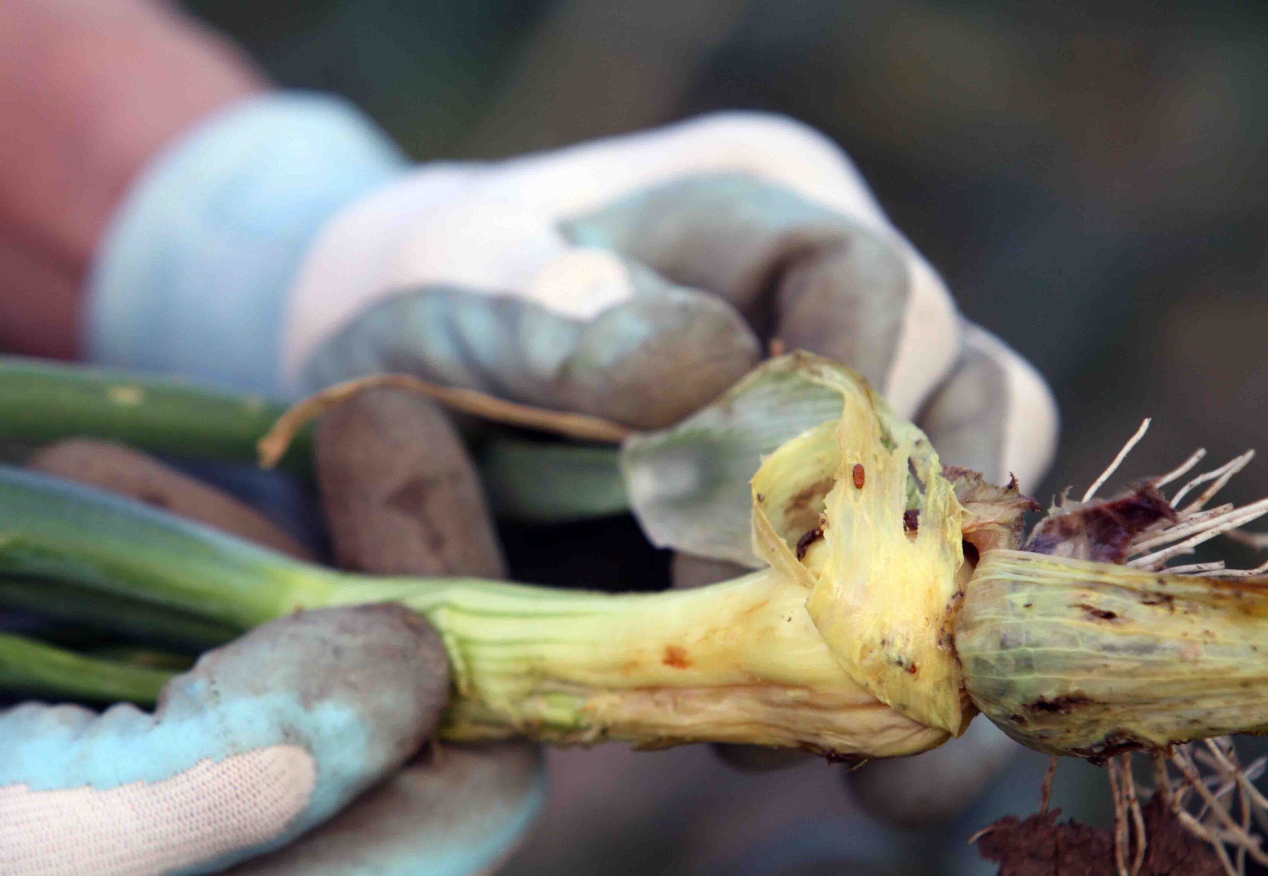 Fotografija naslovnice: Poškodbe na čebuli, ličinke čebulne muhe.