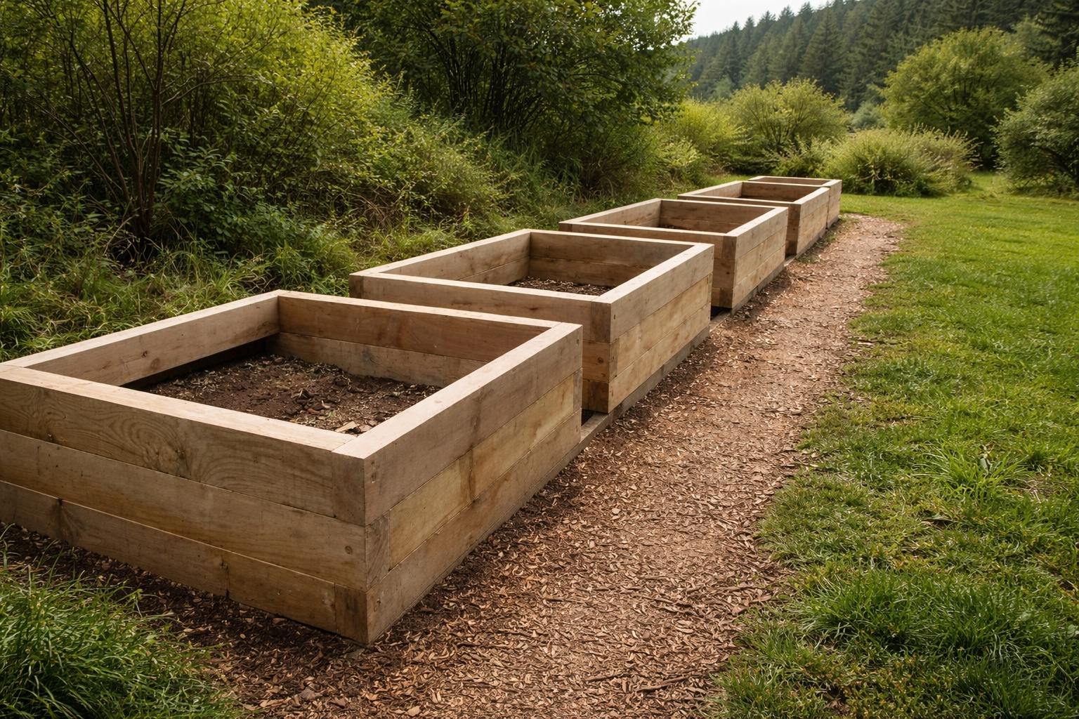Pripis k fotografiji: Visoke grede iz masivnih lesenih tramov, postavljene v liniji ob naravni poti, omogočajo urejen in pregleden vrt z enostavnim dostopom.