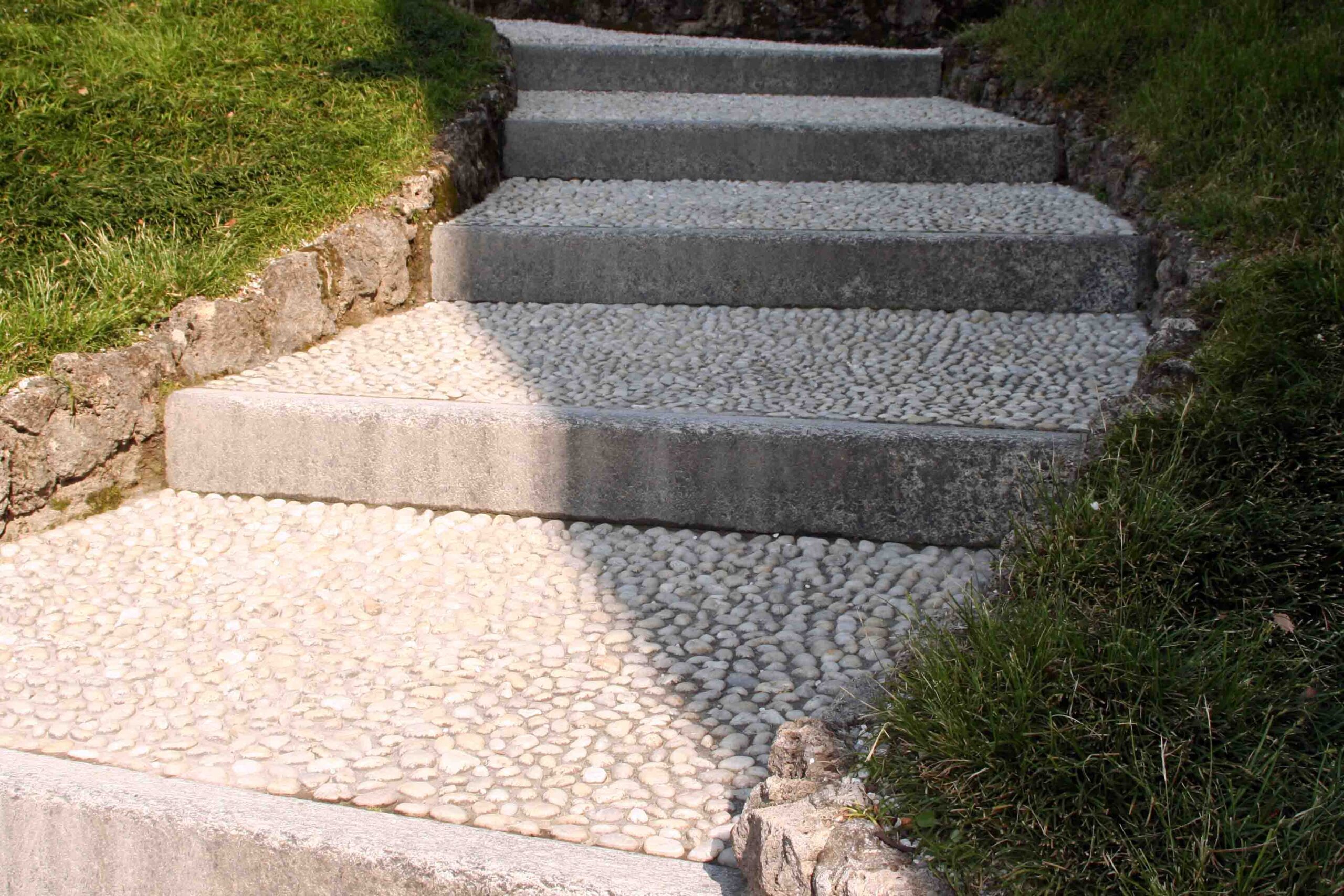 Naslovna fotografija: Betonske vrtne stopnice z tlakovano površino iz prodnikov.