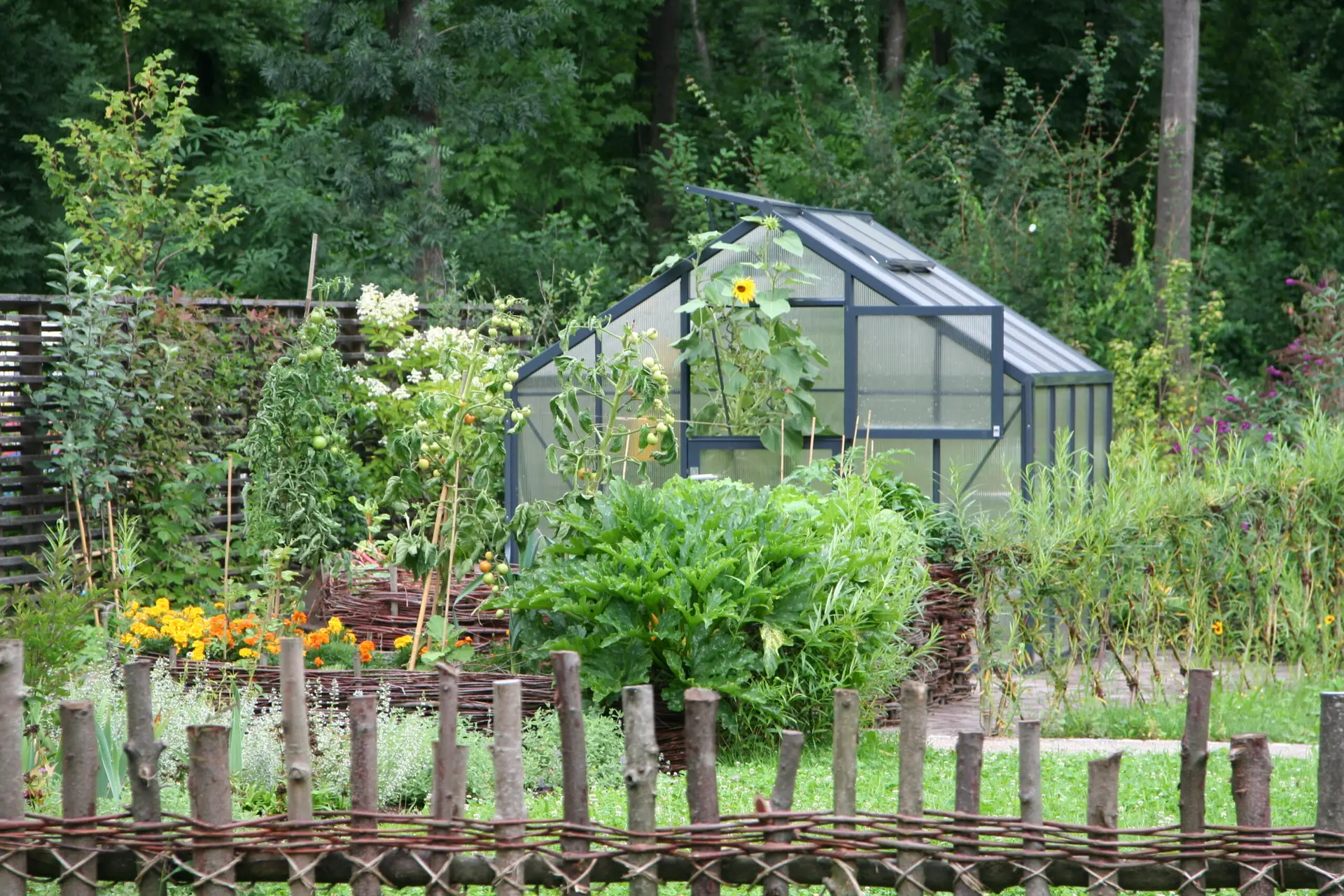 Pripis k naslovni fotografiji: Na fotografiji vidimo prijeten domač vrt, kjer osrednje mesto zavzema vrtni rastlinjak. Rastlinjak je postavljen ob robu vrta, obdaja pa ga pisana zasaditev zelenjave, okrasnih rastlin in cvetlic. Konstrukcija rastlinjaka je izdelana iz kovinskega ogrodja s prozornimi stenami, kar omogoča dovolj svetlobe za rast rastlin v notranjosti. Na strehi je odprtina za prezračevanje, ki je ključna, da se v vročih dneh prepreči prekomerno segrevanje. Rastlinjak na fotografiji je primeren za podaljšanje rastne sezone, saj omogoča zgodnejše sajenje spomladi in kasnejše pridelovanje jeseni.